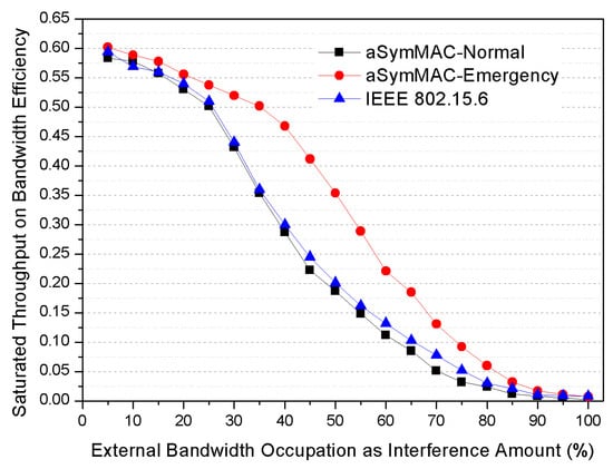 Average saturated throughput depending on bandwidth efficiency according to the external interference on the same frequency compared with IEEE 802.15.6 protocol.