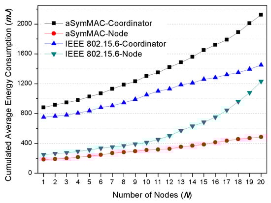 Furthermore, we achieved simulation-based experiments to obtain realistic results compared with IEEE 802.15.6 protocol as shown in Figure 12 and Figure 13 under the same scenario described in the previous subsection and Table 2. In this experiment, we operated a given network composed of one coordinator and several nodes during 100,000 s, and then we individually measured the total energy consumption of them.