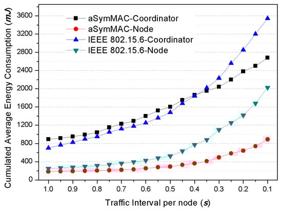 Figure 12 and Figure 13 show the cumulated energy consumption of the coordinator and the node employed in this simulation, according to the variable number of nodes and variable traffic amount. They also show the results of IEEE 802.15.6 protocol with the same conditions. In these figures, the proposed aSymMAC could not show the enhanced performance in PC compared with IEEE 802.15.6 protocol. However, it is not conclusively important in the real environment because a PC generally has the function of energy recharging and also has more powerful energy resource than the micro-sized on-body nodes.