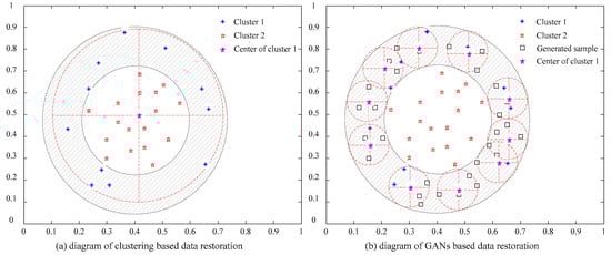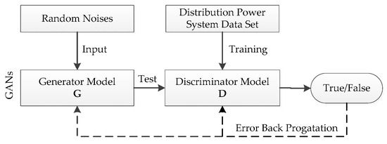 Finally, determine whether the probability of newly generated samples falls within the interval [ 0.5 c , 0.5 + c ] by using discriminator D . If this condition is satisfied, then it demonstrates that generator G performs well in convergence. Combine the new generated sample set D ˜ and original data set D , and denote the combination as D G A N s = { d i } i = 1 N + M for the future data restoration. Otherwise, the discriminative error of D is back propagated to retraining of generator G . More obviously, the calculation processing of GANs could be shown as Figure 2.