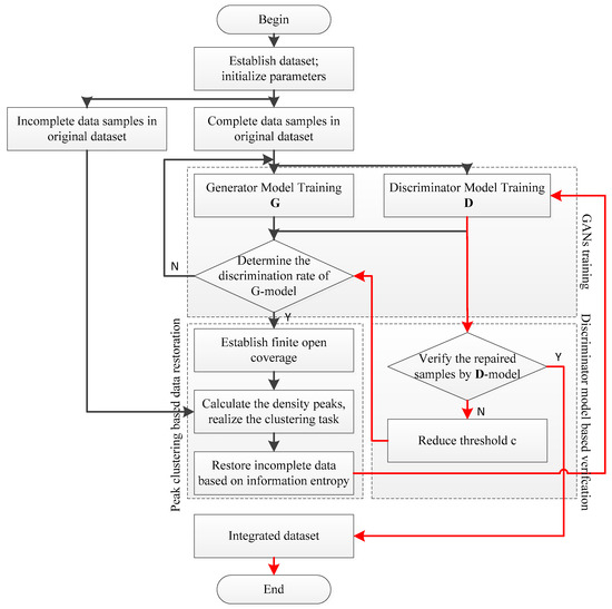 In order to solve the problem that the IPDU heterogeneous data resources are difficult to be effectively utilized in the small sample environment, a novel generative adversarial networks based heterogeneous data integration technology (GANs-HDI) is proposed in this paper. In the GANs-HDI method, the sample space is expanded by introducing GANs, according to the targeted samples with all of the measurement indexes complete. According to all of the complete and fixed samples, peak clustering and information entropy are employed to restore the incomplete ones. Based on the new sample set expanded by the generative model of GANs, this method constructs a peak clustering model to realize the finite open coverage of the restored sample space, and repair those incomplete samples with entropy function. Finally, all of the repaired samples would be checked by using well-trained discriminator of GANs to guarantee the heterogeneous data integration performances. Generally speaking, the process of GANs based heterogeneous data integration could be presented, as shown in Figure 4.