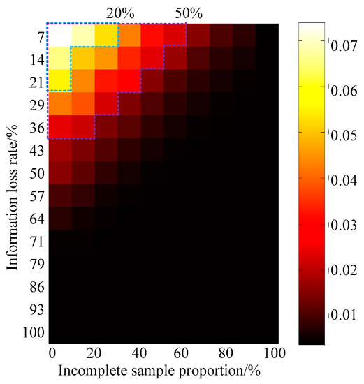 In Figure 5, the color of each color block indicates the reciprocal of the mean of deviation rates from 10 independent repeated experiments with same incomplete sample proportion and information loss rate. The brighter the color, the better the algorithm works. With the decreases of incomplete sample proportion and information loss rate, data integration performance of GANs-HDI algorithm gradually improves. In Figure 4, the boundaries of deviation rate 20% and 50% were marked. It is obvious that, when the incomplete sample proportion is less than 30%, and the information loss rate is less than 20%, the confidence of IPDU heterogeneous data integration is considerably higher. Generally speaking, the larger volume of dataset is, the higher accuracy of data integration would be, and the confidence level of the results of heterogeneous data integration of distribution network will also show an overall upward trend.