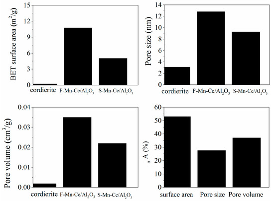 Brunauer–Emmet–Teller (BET) Surface Area, pore size, and pore volume of the fresh (F) and sulfated (S) honeycomb cordierite-based Mn–Ce/Al2O3 catalysts (∆A = (AF − AS/AF) × 100%).