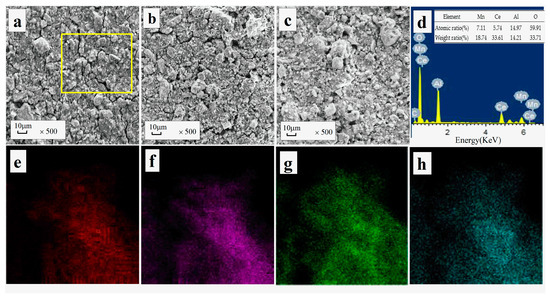 SEM studies were conducted to investigate the change in morphology of the catalysts after the SCR reaction. The SEM images in Figure 4 demonstrate that the surface of the F-Mn–Ce/Al2O3 was smoother and more compact than those of R-Mn–Ce/Al2O3 and S-Mn–Ce/Al2O3. As shown in Figure 4, the surface of the F-Mn–Ce/Al2O3 catalyst is almost flat. However, after SO2 (50 ppm) poisoning, a high degree of aggregation on the surface was observed (Figure 4a,c). Additionally, compared with F-Mn–Ce/Al2O3 (Figure 4a), there was no apparent change on the surface of the R-Mn–Ce/Al2O3 catalyst (Figure 4b), but a few depositions could be seen on S-Mn–Ce/Al2O3 (Figure 4c). This finding can be interpreted as a cause for the decrease in the surface area and pore volume (Figure 3). In addition, EDS displayed the Mn, Ce, Al, C, and O signals, further proving that mixed metal oxide catalysts have been fabricated and supported on the honeycomb cordierite (Figure 4d). To further investigate the dispersion degree of the catalyst powder on the surface of the carrier, the SEM-EDS mapping of the F-Mn–Ce/Al2O3 is displayed in Figure 4e–h. The existence of Mn, Ce, Al, and O elements is clear, and high dispersion is shown (Figure 4e–g), indicating a well-mixed state of the catalyst. The above characteristics are also consistent with the analysis results of EDS.