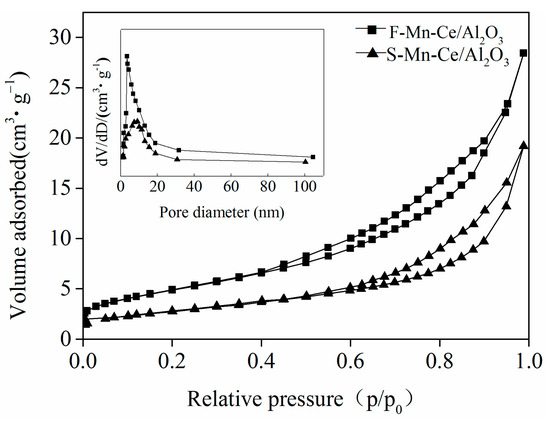 N2 adsorption–desorption isotherms and Barrett-Joyner-Halenda (BJH) pore size distribution of Mn–Ce/Al2O3 before (F) and after (S) poisoning by SO2.