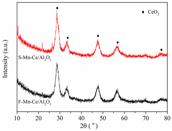 To further understand the microstructure of the poisoned Mn–Ce/Al2O3, XRD analysis was performed. The XRD patterns of the honeycomb cordierite-based Mn–Ce/Al2O3 catalysts before and after the reaction are depicted in Figure 6. Several diffraction peaks observed at 28.95°, 33.29°, 47.49°, 57.16°, and 76.71° could be assigned to a cubic CeO2 crystallite (PDF#34-0394). The peaks attributed to CeO2 could also be seen before and after the SCR reaction [25]. However, no manganese oxide phases could be detected, indicating that the manganese oxides formed as primary crystals of less than approximately 4 nm, which was consistent with the report by Machida et al. [26]. After the reaction, there were no new peaks that emerged on the S-Mn–Ce/Al2O3XRD curve, which indicated that no crystal sulfate phase was formed on Mn–Ce/Al2O3 after the reaction or that the surface sulphate amount was below the detection limit [27].
