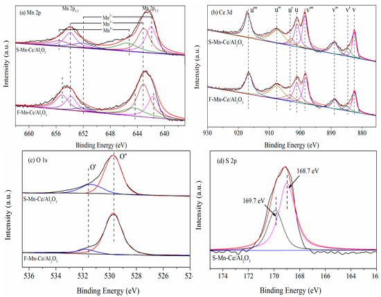 The Mn 2p XPS spectra of the fresh and sulphated Mn–Ce/Al2O3 samples are shown in Figure 7a. Two peaks, due to Mn 2p1/2 and Mn 2p3/2, were observed from 637.0 eV to 662.5 eV, which are characteristic of a mixed-manganese system (Mn2+, Mn3+, and Mn4+) [28]. The Mn 2p XPS spectra of the F-Mn–Ce/Al2O3 could be classified into six subpeaks: Mn2+ (641.6 and 652.1 eV), Mn3+ (643.1 and 653.9 eV), and Mn4+ (644.2 and 655.1 eV) [29], indicating that Mn2+, Mn3+, and Mn4+ co-exist on the surface of the catalysts. Compared with F-Mn–Ce/Al2O3, the Mn 2p peak for the poisoned S-Mn–Ce/Al2O3 slightly shifted to a higher binding energy (0.2–0.5 eV higher), which may be attributed to the formation of species other than manganese oxides for Mn–Ce/Al2O3, which could occur when catalysts are sulfated, shifting them to a higher binding energy [30]. Here, the binding energies were shifted higher during the SCR reaction in the presence of SO2, which means that the Mn species on the surface of the Mn–Ce/Al2O3 catalyst were less active, thus resulting in performance degradation. In addition, Kapteijn et al. [31] demonstrated that Mn4+ has a better redox ability than Mn2+and Mn3+ over the spectrum of manganese-based catalysts. For the two samples, the ratio Mn4+/(Mn2++Mn3++Mn4+) can be calculated from the characteristic peaks intensities of Mn2+, Mn3+, and Mn4+. The ratio of Mn4+/(Mn2++Mn3++Mn4+) decreased by 8.86% for F-Mn–Ce/Al2O3 and S-Mn–Ce/Al2O3. Therefore, the decreased concentration of Mn4+ can also reflect the reason for the activity decrease.