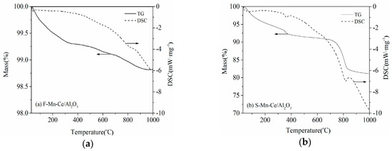 Figure 8a shows the TG and Differential Scanning Calorimetry (DSC) curves of F-Mn–Ce/Al2O3, in which the TG curve presented one primary weight loss at approximately 80 °C, with the DSC curve revealing a corresponding valley. The weight loss was attributed to the desorption of adsorbed water on the catalyst [41]. In the TG-DTA curves of S-Mn–Ce/Al2O3 (Figure 8b), there are three main weight losses at approximately 80 °C, 370 °C, and 790 °C. The weight loss at 370 °C was attributed to the decomposition of NH4HSO4 into (NH4)2S2O7 and H2O, and the (NH4)2S2O7 decomposition generated NH3, SO2, H2O, and N2, as reported in the literature [42,43]. According to the report, the decomposition temperature of Ce2(SO4)3 or Ce(SO4)2 was greater than 700 °C [34]. Therefore, sulfated CeO2 decomposition or desorption can explain the weight loss peak at 790 °C. Upon completion of the TG-DTA analysis, it can be concluded that ammonium hydrogen sulfate and sulfated CeO2 were formed during the reaction process in the presence of SO2.