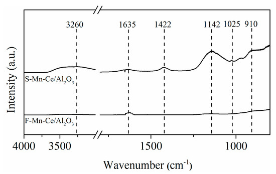 Fourier transform infrared (FT-IR) spectra of fresh (F) and used (S) Mn–Ce/Al2O3 catalyst.