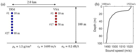 Figure 1. (Color online) Schematic of virtual source array (VSA)-based time reversal (TR) focusing and waveguide conditions used for numerical simulations. (a) Different vertical arrays, denoted by time-reversal mirror (TRM) (blue circle) and VSA (red circle), of 27 and 17 elements with 3-m array spacing are considered in 100-m deep shallow water; (b) Sound speed profile used for normal mode simulations.