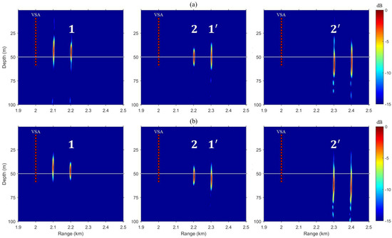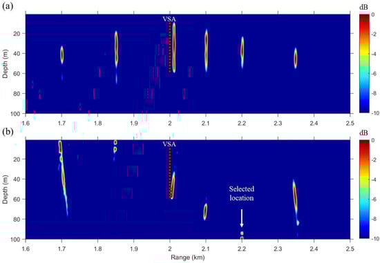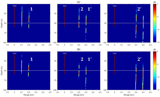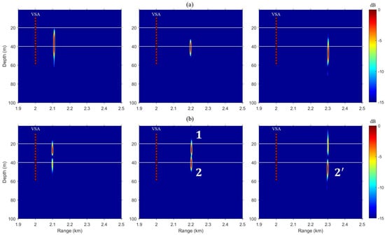 Figure 8 and Figure 9 provide a clear understanding of VSA-based multiple TR focusing using SVD method in sound speed mismatch environment. The selected locations were changed to r s 1 = (2.2 km, 20 m) and r s 2 = (2.3 km, 40 m) to show the dramatic results of VSA-based multiple TR focusing using SVD method, and the results were compared to VSA-based single TR focusing results at a selected location, r s 2 = (2.3 km, 40 m).