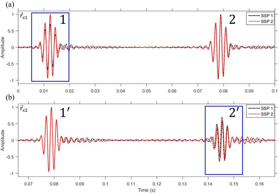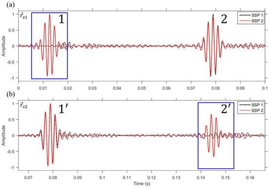 First, we take a look at the case of the superposition method which is the most intuitive method of simultaneous multiple focusing. The sampled transfer functions between the TRM and VSA are time delayed corresponding to a line-of-sight distance between the VSA and selected locations r s 1 = (2.2 km, 50 m) and r s 2 = (2.3 km, 50 m), respectively, and then superimposed prior to backpropagation from the TRM. Figure 3 shows the simulated time series at two selected locations for two different profiles, i.e., the isovelocity with a sound speed of c = 1500 m/s (SSP 1, dot-dashed) and the downward-refracting SSP (SSP 2, solid). Since the sampling frequency is 7500 Hz and fast Fourier transform size is 8192, the time duration is 1.09 s long. This time duration is not sufficient to prevent aliasing on the time axis as the pulse propagates (e.g., 2200 m 1500 m / s ≈ 1.5 s). Thus, a random time shift was applied to the time series results. Not surprisingly, imperfect pulse compression is achieved at both selected locations, r s 1 (see Figure 3a) and r s 2 (see Figure 3b), owing to the residual term of the phase-conjugated field,