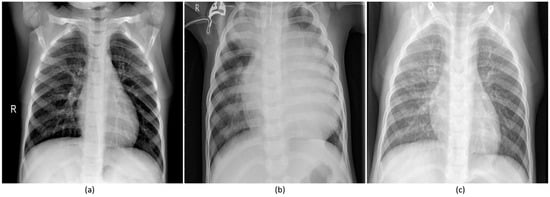 Pneumonia is a significant cause of mortality in children across the world. According to the World Health Organization (WHO), around 2 million pneumonia-related deaths are reported every year in children under 5 years of age, making it the most significant cause of pediatric death []. Pneumonia sourced from bacterial and viral pathogens are the two leading causes and require different forms of management []. Bacterial pneumonia is immediately treated with antibiotics while viral pneumonia requires supportive care, making timely and accurate diagnosis important. Chest X-ray (CXR) analysis is the most commonly performed radiographic examination for diagnosing and differentiating the types of pneumonia []. However, rapid radiographic diagnoses and treatment are adversely impacted by the lack of expert radiologists in resource-constrained regions where pediatric pneumonia is highly endemic with alarming mortality rates. Figure 1 shows sample instances of normal and infected pediatric CXRs.