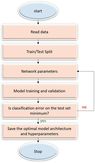 A sequential CNN model belongs to the class of deep, feed-forward artificial neural networks that are commonly applied to visual recognition []. It is a linear stack of convolutional, nonlinear, pooling, and dense layers. We optimized the sequential CNN architecture and its hyperparameters for the datasets under study through Bayesian learning [,]. The procedure uses a Gaussian process model of an objective function and its evaluation to optimize the network depth, learning rate, momentum, and L2-regularization. These parameters are passed as arguments in the form of optimization variables to evaluate the objective function. We initialized the search ranges to [110], [1 × 10−7 1 × 10−1], [0.7 0.99], and [1 × 10−10 1 × 10−2] for the network depth, learning rate, momentum, and L2-regularization respectively. The objective function takes these variables as input, trains, validates and saves the optimal network that gives the minimum classification error on the test data. Figure 3 illustrates the steps involved in optimization.