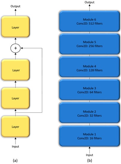 The architecture of customized residual CNN: (a) Residual block; (b) Customized residual CNN stacked with six residual blocks.