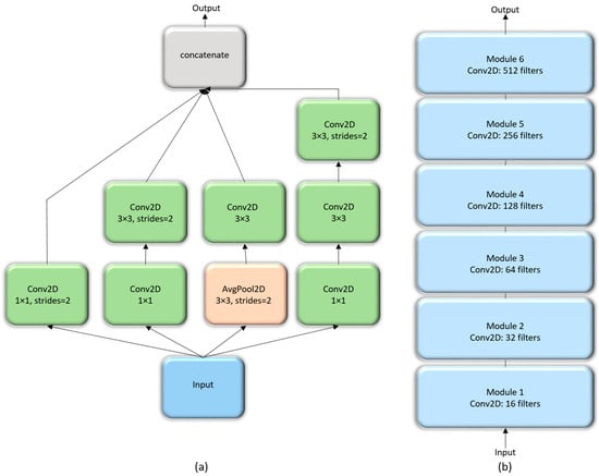 The architecture of customized InceptionV3 CNN: (a) InceptionV3 module; (b) Customized Inception CNN stacked with six InceptionV3 modules.