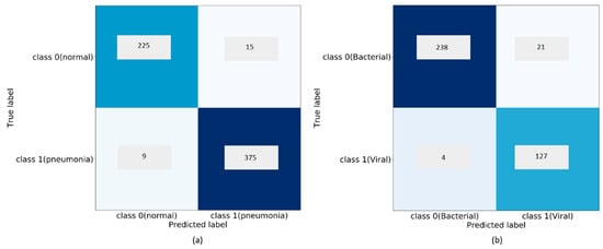 Confusion matrices for the performance of the customized VGG16 model: (a) Normal v. Pneumonia; (b) Bacterial v. Viral Pneumonia.