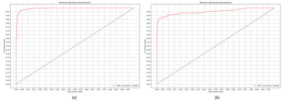 ROC curves demonstrating the performance of the customized VGG16 model: (a) Normal v. Pneumonia; (b) Bacterial v. Viral Pneumonia.
