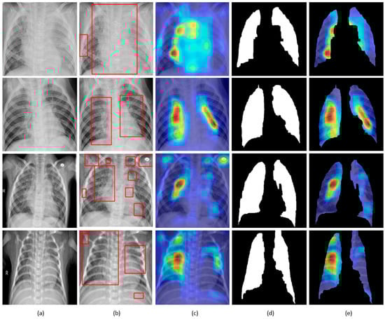 Visual explanations through gradient-based localization using CAM: (a) Input CXRs; (b) Bounding boxes localizing regions of activations; (c) CAM showing heat maps superimposed on the original CXRs; (d) Automatically segmented lung masks; (e) CAM showing heat maps superimposed on the cropped lungs.
