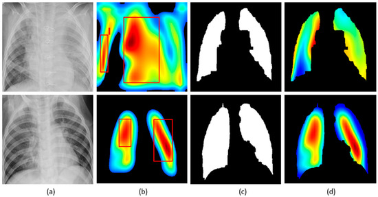 Visual explanations through average-CAM: (a) Bacterial and viral CXR (top and bottom); (b) Average-CAM localizing class-specific ROI with bounding boxes highlighting the regions of maximum activation; (c) Automatically segmented lung masks; (d) Average-CAM localizing class-specific ROI with the extracted lung regions.