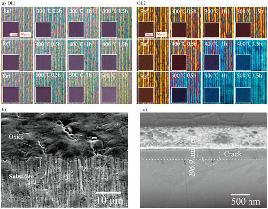 Macroscopic color and microscope images of (a) sample oxide layer 1 (OL1) and oxide layer 2 (OL2) before and after the thermal annealing at 300, 400, and 500 °C, duration of 0.5, 1.0, and 1.5 h, respectively. (b) SEM image of the oxide and substrate surface (c) FIB-SEM section image of the oxide thickness. (FIB-SEM: focused ion beam combined with scanning electron microscope)
