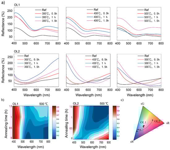 (a) Experimental reflectance spectra of Sample OL1 and OL2 with post-thermal annealing at 300, 400, and 500 °C, duration of 0.5, 1, and 1.5 h; (b) reflectance spectra of samples OL1 and OL2 (normalized by their respective maximum values) with different annealing times at 500 °C. (c) Color evolution of OL1 and OL2 reported on sRGB color space.