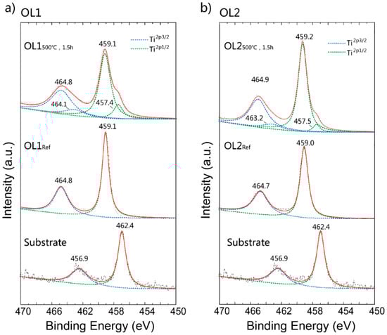 Table 1 shows the change in chemical element compositions of OL1 and OL2 before and after the annealing process at 500 °C for 1.5 h. Specifically for OL1, the atomic percentage of O rises from 24.0% to 70.0%, while that of Ti falls from 70.9% to 25.6%, indicating a significant increase in O content after annealing OL1, despite an evident change in color. Actually, the color hue of OL1 was not significantly changed after annealing. It is found that the increased ratio of O and Ti after annealing could indicate further oxidation as a result of thermal annealing. For OL2, the atomic percentage of O rises from 14.6% to 66.1%, while that of Ti falls from 79.3% to 29.4%. Before annealing, the ratios of O:Ti in both oxide layers are significantly less than 2, which means that the Ti surface has not been fully oxidized. Because the energy dispersive X-ray (EDX) detecting depth is around 100~1000 nm, while the thickness of the oxide is under 200 nm, this result is probably due to incomplete oxidization of the titanium surface or detection of the titanium substrate. However, the ratio increases above 2 after post-annealing, which means that the surface has been further oxidized and probably polluted with other oxides. Figure 3a,b shows the XPS spectra of OL1 and OL2 before and after thermal annealing. The Shirley function is applied for background correction. The peaks fit with Lorentzian–Gaussian. Figure 3a shows the Ti 2p3/2 and Ti 2p1/2 peaks at binding energies of 456.9 eV and 462.4 eV, respectively, for the Ti substrate. OL1Ref shows the Ti 2p3/2 and Ti 2p1/2 peaks at binding energies 459.1 and 464.8 eV, respectively, both of which are attributed to TiO2 []. Although the XPS spectra of OL1500°C,1.5h show the same main peaks at that of OL1Ref, they also contain several sub-peaks of Ti 2p3/2 and Ti 2p1/2 at binding energies of 457.4 eV and 464.1 eV, respectively. These are attributed to Ti2O3, as referenced by other works []. Figure 3b shows the Ti 2p3/2 and Ti 2p1/2 peaks of OL2Ref at binding energies 459.0 eV and 464.7 eV, respectively. After the annealing, the spectra display main peaks of Ti 2p3/2 and Ti 2p1/2 at 459.2 eV and 464.9 eV, respectively, as well as sub-peaks at binding energies of 457.5 eV and 463.2 eV, respectively, that are attributed to Ti2O3 [].