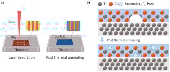 Another possible explanation is the Ti2O3 generated by the annealing treatment, as shown by the XPS spectra. Researchers have reported that Ti2O3 could be generated under an insufficient oxygen environment, which has an intrinsic color of yellow or blue depending on its lattice imperfections [,]. Therefore, the appurtenance of Ti2O3 to the Ti surface is thought to be the reason for the yellow or blue color. The model of the oxidation process during annealing is depicted in Figure 4b. As the initial laser oxidation process is intense and dynamic, with elevated-temperature exposure, the oxide film suffers from thermal and growing stress, and thus forms cracks and pores inside the film []. Therefore, the original oxide film is not airtight and contains internal defects. During the annealing process, titanium can continues to be oxidized through the inward diffusion of oxygen or with the permeation of oxygen through the oxide layer. Due to insufficient oxygen, Ti2O3 is generated in these pores and cracks. At the same time, the original TiO2 could also be reduced with the Ti3+ or oxygen vacancy contained []. Since the TiO2 layer is transparent, the yellow or blue Ti2O3 is visible and able to tune the macroscopic color of the substrate surface.
