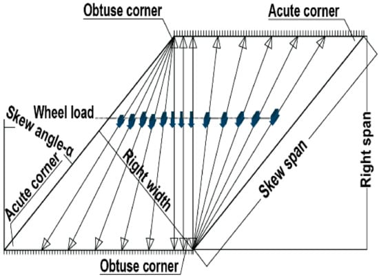 Skewed composite high-performance-steel (HPS) I-girder bridges are an economical solution for modern highways subject to space constraints in congested urban areas, providing roadway alignments with low environmental impact and minimal pollution for new road construction projects. However, unlike in right-angle (non-skew) bridges, where the load transfer to the support is linear, skewed superstructures create high complexity in the force flow. In such structures, the load path tends to follow the shortest route to the supports at the obtuse corners of bridge spans, as shown in Figure 1. Skewness in the superstructure leads to concentration of the reaction forces and negative bending moments at the bridge’s obtuse corners, along with a small reaction and possibility of uplift reaction forces at its acute corners [,,,,].