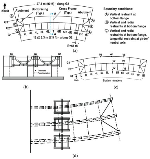 Phase one of the full-scale laboratory test was performed at the Turner–Fairbank Highway Research Center in McLean, Virginia (CSBRP project) []. This involved testing a horizontally curved composite slab-on-girder bridge subjected to construction and vehicle loads in order to verify the FE modeling. The bridge erected for this investigation was a 27.5 m simple-supported bridge with three steel concentric girders (G1, G2 and G3) spaced at intervals of 2.7 m. The ratio of curvature (k) to G2 was 0.45. A plan view and cross section of this bridge is shown in Figure 3. Tubular K-type cross frames with a diameter of 12.70 cm and a thickness of 0.635 cm were installed at different locations between the girders, as shown in Figure 1a. Full depth bearings were installed at multiple locations along the girders; the boundary conditions for the spherical bearings at the abutments are also shown in Figure 1. Load was applied to approximately the third point of each girder for the bending component test and this placed the load on G3 outside of the splices shown in Figure 3. Load application was accomplished by jacking the girders away from a series of loading frames that were tied with DYWIDAG bars to the laboratory strong floor. The frames consisted of channel pairs placed back-to-back and connected orthogonally to one another so that they formed the boxes shown in Figure 3d. Another back-to-back channel pair bisected each box and was used as a spreader beam to apply the loads. DYWIDAG bars, which were attached to the ends of the spreader beams, were selected because they provide high tensile strengths with minimal flexural stiffness. The mid-span girder deflections, rotations and strain distribution across the flanges and through the webs were recorded using potentiometers and tilt meters.