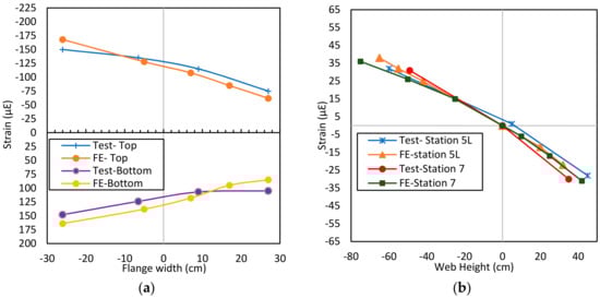 Strain at flanges and web of G3 from Test and FE analyses: (a) flange width; (b) web height.