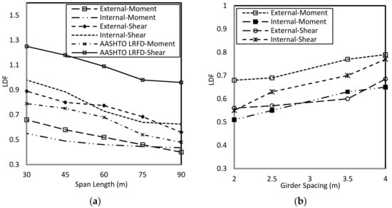 Bridges with a span length of 45 m and three lane loads, with girder spacings ranging from 2.0 to 4.0 m as described in Table 2, were investigated to verify whether girder spacing should be considered in the new proposed equations. Figure 7b indicates that the LDFs for the external and internal girders increased by approximately 14% and 22%, respectively, for the bending moment and by up to 18% and 28%, respectively, for the shear forces. These results follow the same trend as those reported by Zokaie [] for ordinary bridges. Note that the girder spacing depends on the number of girders, as described earlier.