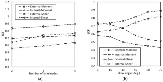 Next, the effect of the number of lanes within the same bridge width and span length was investigated. The results shown in Figure 8a reveal that increasing the number of lane-loads for a bridge with a total width of 13 and span length of 60 m increases the LDFs for shear force and bending moment by up to 15% and 7%, respectively. This suggests that the new LDF equations being developed should include the effect of the number of lane loads. A similar trend has been reported by researchers working on skewed composite slab-on-girder bridges constructed with conventional materials [,].