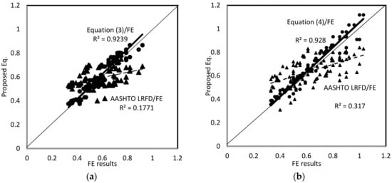 The ratios of the LDFs from the proposed equations to the finite element values, shown in Figure 9, were used to verify the accuracy of the newly deduced LDF equations (Equations (3)–(6)) for bending moment and shear force. The coefficient of determination, R2, ranged from 0.899 to 0.930, indicating that the variation in the data falls with the acceptable range. In particular, the low value of R2 obtained for the ratio of AASHTO LRFD to FE results indicates that the current specification is unable to predict the LDFs for this type of bridge correctly. Table 3 shows the statistical results for the average (AVG.), standard division (SD.), and coefficient of variation (COV.) for the ratio of the results obtained using the proposed equations to those from the finite element analysis. The slightly-greater-than unity average obtained for the regression analysis reveals that the newly developed equations are indeed able to predict the LDFs for shear force and bending moment conservatively. The SDs listed in Table 3 range from 0.069 to 0.094 and the CVs are between 0.067 to 0.085, both of which confirm that the proposed equations can be used to determine LDFs for skewed bridges with HPS girders.