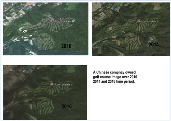 Hokkaido Island has approximately 60,000 km2 forests that supplies 20% of Japan’s food [24]. The forest, biodiversity, and natural beauty of the islands is unique and attracts foreigners to buy forestlands. The plant species diversity and richness of the Japanese forests are very important to maintaining, conserving, and restoring biodiversity [55,56]. About 40% of the Japanese forests are plantation types, and like other parts of Japan, the Hokkaido’s forest followed thinning and clear-felling harvesting techniques for both planted and natural forests [22]. However, thinning (through coppicing) has been commonly practiced in Japan, which also has a good reputation regarding maintaining forest biodiversity rather than using a clear-felling technique [57]. The percent of tree canopy cover appeared to be a significant parameter explaining the changes in the understory plant community [58]. This means the forest management systems have a deep relationship with biodiversity. On the contrary, forest fragmentation could not decrease overall species richness, some species (especially rare one) have been shown to be particularly sensitive to habitat fragmentation [55,59]. In the western part of Japan, forest fragmentation had a decreased species richness of lucidophyllous forests [55]. The results of the study found out that the land-grabbed companies used a clear-felling technique to open the forestland and created some forest fragmentations. Simple satellite images in Figure 3 clearly show that the forest cover of the Chinese golf course remained the same over the time period although the company destroyed many tree species and caused forest fragmentation. One of the scientific study concluded that 21 to 33% of tree cover was damaged in the road construction process in the steep terrain forests of Turkey [60]. The study also mentioned that around 12.23% to 16.13% forest cover was destroyed through road construction work in the mountainous area. Moreover, among the human-made activities that caused species loss, the infrastructure development produced some of the greatest rate of eliminating local species [61,62,63,64,65]. Therefore, it was common for the human-made development activities in the grabbed forestland to affect the forest tree-cover loss. On the contrary, the interviewed person mentioned that the amount of forestland owned by the foreigners was very small (only 15.8 Square kilometer in all of Japan) in order to measure the impacts of tree cover or species loss. They also informed that the foreign companies maintained the basic criteria for keeping tree cover (percentages) for further development plan in their purchased forestland. One Chinese company needed to change their development plan due to deviation of the tree cover criteria. Therefore, the screening and monitoring system of the Japanese local government was very strict and there was no scope of violating the conservation criteria. These monitoring and execution systems of Japan have clearly showed a positive sign for the future development and conservation of biodiversity in the grabbed forest areas. The fears of local people regarding China’s land grab based on Hokkaido’s water resources [15,27]; furthermore, the inadequate water rules and regulations of Japan is a limiting factor for developing a sustainable forest water use policy [28]. Scientist argued that water resources, more than any other resources, are affected by the development activities of the society [60]. Water and food security became a hot topic and a lot of land grabbing by the foreign companies was also taking place worldwide [10,34,54]. The Hokkaido local and provincial government authorities clearly stated that they welcomed the foreign investment; however, the foreign entities also needed to ensure the proper uses of water resources and conservation criteria. Therefore, from the government and expert viewpoint, there was no need to worry about the negative ecological impacts of forestland grabbing at that moment. On one hand, the development activities in the designed forestlands have created some tree cover loss, and on the other hand, those activities have created good economic outcomes, the expansion of tourism, and employment opportunities for the local people. Therefore, the local government and forestry agencies staff did not want to stop the foreign investments process through the law or strict intervention.
