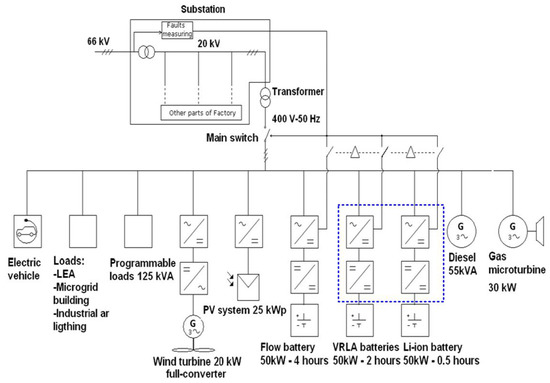 Diagram of the ATENEA microgrid at The National Renewable Energy Centre (CENER). A blue dashed box indicates the two possible direct current–alternating current (DC–AC) converters that can implement the proposed strategies.