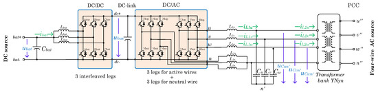 In consonance with the available storage technologies, a DC voltage range from 150 to 500 VDC is considered. With this configuration, a DC–DC converter interfaces with this wide DC voltage range by means of a three-phase interleaved topology. By the use of an interleaved topology, the output inductive filter size is split and reduced, so it makes for easier operation and maintenance tasks. At the same time, high power converters could be designed with lower current modules, reducing the voltage and current ripple in the DC-link and decreasing the power capacity of the inductors [46]. Thus, as cited in [47], the reliability of an interleaved DC–DC converters increases compared with conventional one leg devices.