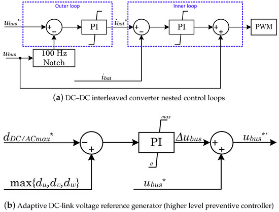 The DC–DC converter is controlled by means of two nested control loops, as shown in Figure 3a. The inner control loop manages the battery inductor, , and limits the maximum desired battery current, . As detailed in Section 2.2, an interleaved topology is chosen, so a 2/3 rad/s shifted phase PWM strategy is used with the same duty cycle for all the converter’s legs. The outer control loop controls the DC-link voltage, . Because of the unbalanced nature of AC connected loads, low frequency voltage ripples (at ≃100 Hz) in the DC-link can be severe. This voltage control loop needs a high bandwidth to overcome this ripple and keep constant . Thus, an adaptive 100 Hz notch filter [50] is used in the feedback control chain for this purpose to quickly compensate for any variation around the fundamental rated grid frequency (50 Hz).