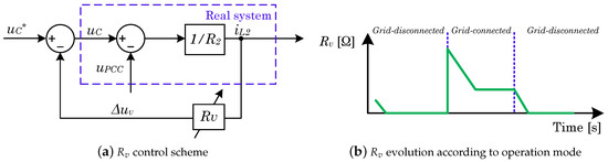 The adaptive virtual resistance concept is currently used for hot-swapping (soft-start) [6] and to smooth the effect of grid fluctuations. In this case, it is also applied to enhance the transference between operation modes, as is later shown in Section 4.2. It should be noted that the virtual resistance should be disabled progressively to not affect the operation of a pure V/f strategy in the grid-disconnected mode. Figure 4b illustrates the proposed behaviour of the module during and between the operation modes. Furthermore, as it has been aforementioned, this fact makes it possible to improve the time response performance in grid-disconnected mode thanks to the master voltage role change between the mains and the converter.