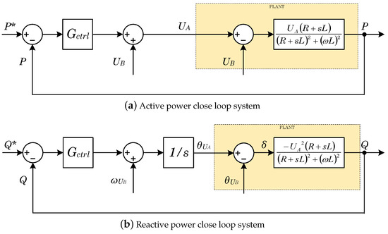 Classical AC droop control operation principles are obtained from the steady-state equations that describe the power flow between two AC voltage sources connected by an inductive line, as widely detailed in [6,28]. A predominant resistive behaviour is adopted by using the virtual impedance concept [29,30] to provide a reliable relationship between the sets active-reactive power and voltage-frequency, being as independent as possible from the grid impedance. The virtual resistance concept is described in Figure 4. In Figure 4a, designs the controlled AC voltage, is the voltage of Point of Common Coupling (PCC), the physical equivalent series resistance of , and is the value of the virtual resistance (see Figure 2).