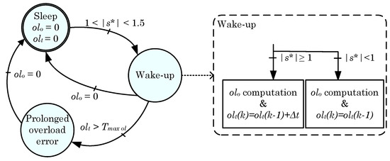 based on the computation. In this sense, the term is an indicator of the over-load energy exchanged, is the desired current and t is the time interval of the over-current. The over-load algorithm is managed according to the state diagram shown in Figure 6. Time t begins when , being the maximum apparent power per phase reference. When , the observer enters to the Wake-up step, starting to compute (Equation (1)) and (accumulative time under the over-load situation). If the value reaches zero, the observer returns to a Sleep step, where and are reset. If the is bigger than zero, depending on the present s value, the accumulated time is incremented or maintained. Keeping the time constant, it is ensured that the inverter is not over-loaded intermittently producing possible thermal degradations. In the case that the term becomes higher than a pre-set threshold , the system evolves to the Prolonged over-load error step and s is limited to 0.8. In this way, is forced to decrease until zero. Then, the system evolves to the Sleep step again.
