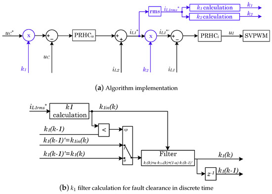 Figure 7 shows the proposed block diagram of the short-circuit proof mechanism. The conventional voltage and current stationary frame controllers can be seen in black, i.e., Proportional Resonant with Harmonic Compensator (PRHC) controllers, where the subscript u and i refer to voltage and current, respectively. is the objective AC capacitor voltage, the current AC capacitor voltage, and the inverters’ output voltage. and are the inverters’ output inductance and grid coupling inductance. The superscript designs the reference, and the subscript is the root mean square (rms) computed value.