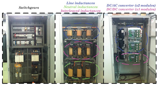 The converter presented in Section 2 is based on three Semikron IGD-2-424 power stacks (Semikron, Nuremberg, Germany). The control is implemented into two TMS320F2809 DSP-based control boards, one dedicated to control the general operation state machine and the DC–DC interleaved converter and the other committed to controlling the inverter. Control strategies are executed at 8 kHz. The hardware and software relevant parameters for the DC–AC and the DC–DC converters are summarised in Table 1 and Table 2. Figure 8 shows a picture of the full converter. Furthermore, all short-circuit faults and recoveries are generated using a switch-line breaker (ABB OT200) and considering wires with less than 0.1 m.