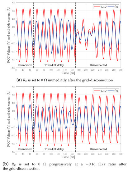 In Figure 9, the effect of the value on the voltage and the delivered current can be observed when a grid-connected to grid-disconnected transference takes place. In the initial situation, * is set at 30 kW before t = 50 ms and a local load of 1.81 is connected at any time. The use of an initial allows for smoothing the transference in terms of voltage and currents.