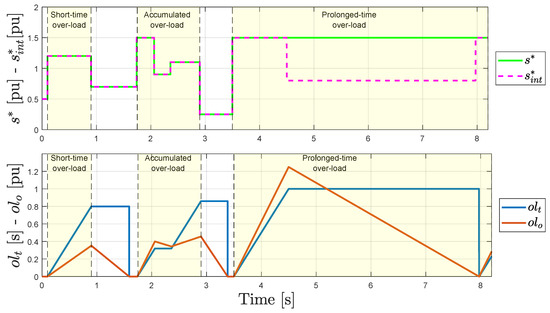 In Figure 11, three different study cases framed in yellow can be observed. The first one refers to a short-time over-load demand. The second one accumulates two over-load queries. Finally, the third one evaluates a prolonged over-load target. The maximum over-load time, , is set to 1 s.