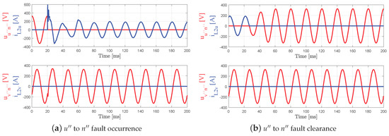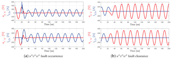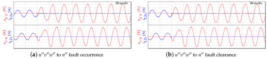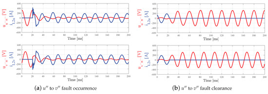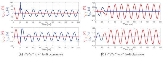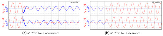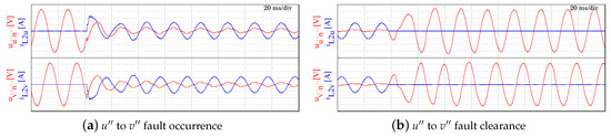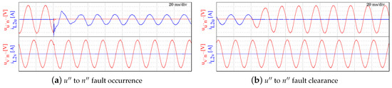 Scenario 2—Phase to phase short-circuit. Figure 13a,b show the behaviour of the voltage and current of phases and when a bipolar short-circuit is generated and recovered. It can be deduced and , as can be also observed in Figure 13b. This case is particularly interesting because, although the current is properly managed in the steady-state, it can be seen that the voltage does not go to zero after the fault.
