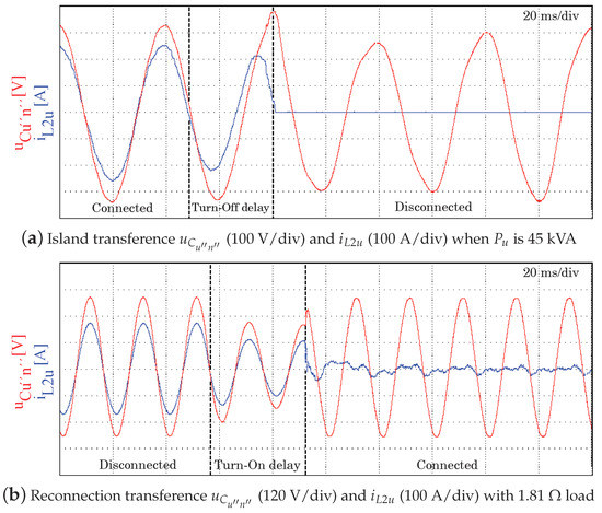 Scenario 2—Transition from grid-disconnected to grid-connected with load. A reconnection procedure is intentionally done with a high current local load. Figure 16b allows for observing that, after the reconnection, the voltage suffers a dip during two cycles, but the current is extinguished just after the reconnection is finished. The experimental results are close to the simulation shown in Figure 10b, validating the exposed method.