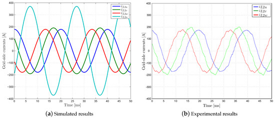 The objective of this section is showing the capability of the inverter to control unbalanced phase currents as mentioned in Section 1 and required for the proper use of the over-load supervisor strategy suggested in Section 4.2.2. In this scenario, the inverter is operating in grid-connected mode with rated (non over-loaded) unbalanced set-points. The set-points per phase are = = 30 kW, = −30 kW and all nulls. Figure 17 shows that the inverter is able to synthesize non-balanced currents from non-balanced references.