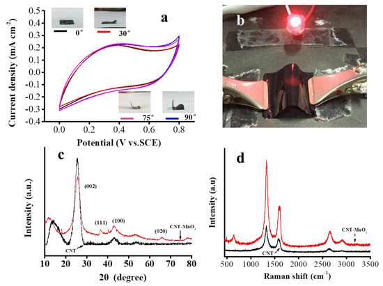 (a) CV curves of the composite at different bending angles at 5 mV s−1; (b) photographic demonstration of the sample MCP40S60 as the flexible composite; (c) XRD patterns of CNT and MnO2/CNT; (d) Raman spectra of CNT and MnO2/CNT.