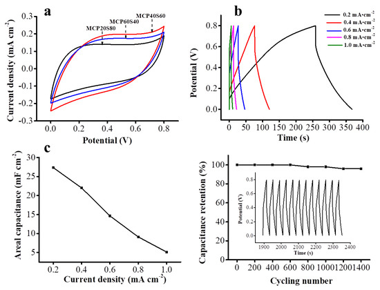 (a) CV curves of the supercapacitors with different PCL contents at 5 mV s−1; (b) galvanostatic charge/discharge curves of MCP40S60 supercapacitors collected at different current densities; (c) areal capacitances of MCP40S60 supercapacitors at different current densities; (d) cycle stability of MCP40S60 electrode film at 0.6 mA cm−2.